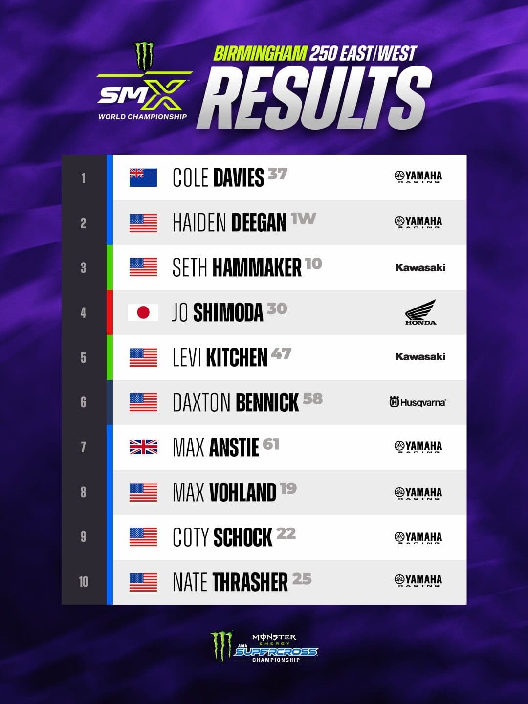 The 250SMX Class came into Birmingham with heightened tension as the first East/West Showdown of the 2026 season brought together the best of both the Western and Eastern Divisional Championships. The 15 Minute + 1 Lap Main Event began with Monster Energy Pro Circuit Kawasaki’s Levi Kitchen alongside Monster Energy Yamaha Star Racing’s Cole Davies, the Eastern Divisional points leader. Kitchen edged out the young New Zealander for the holeshot and the pair then defined the first half of the race by trading for the lead three times before Davies appeared to assert his control of the Main Event with just over seven minutes remaining.